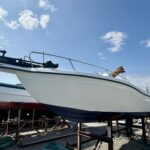 「船体全体のくすみとサビが目立ってきたので、一度しっかり綺麗にしたい」とのご相談。フェンダーによるゴム汚れ、船底のフジツボや藻の除去、船体の汚れ、錆び取り、デッキの黒ずみ除去。ボートオーナー様も「毎年のことだからプロに任せたい」とのことでした。