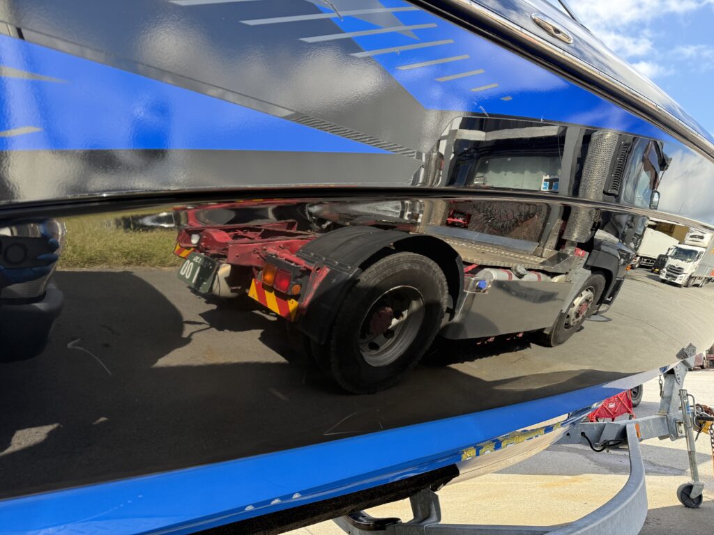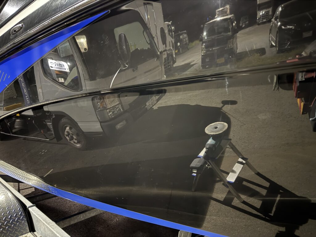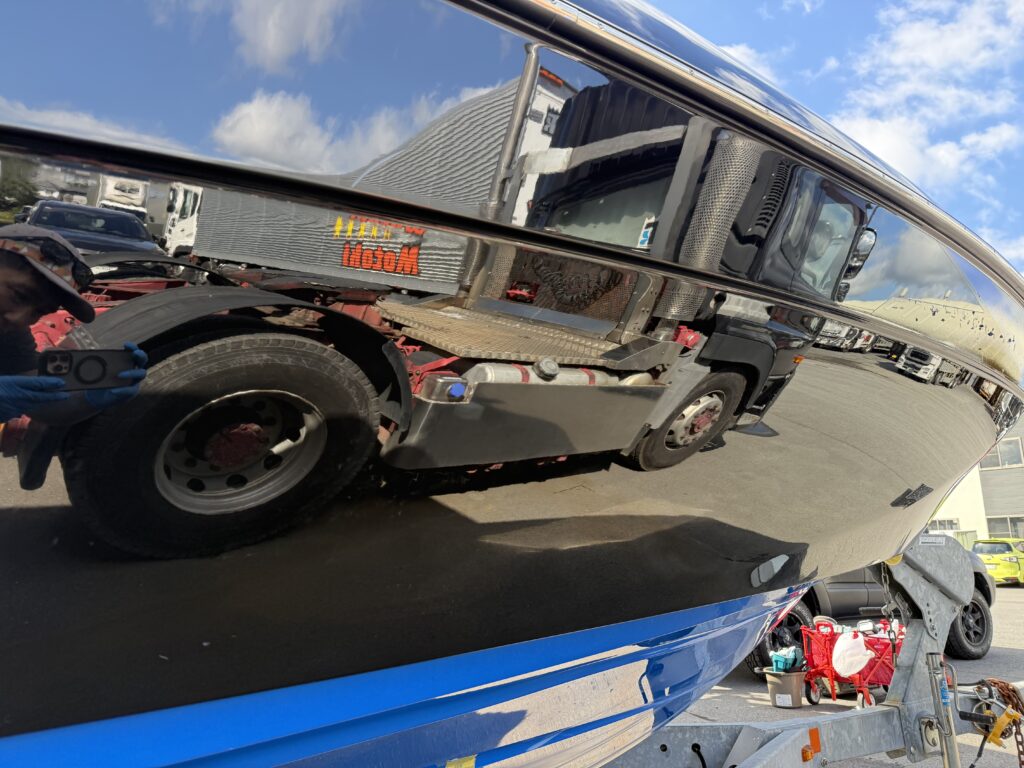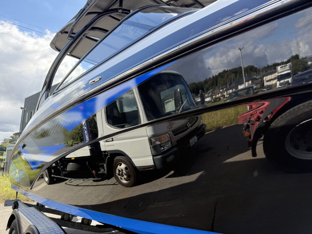 丁寧にポリッシャーで磨いた後にカルナバロウ入りワックスでツヤ・撥水性を復活!くすんだハル面も鏡のようになりました。